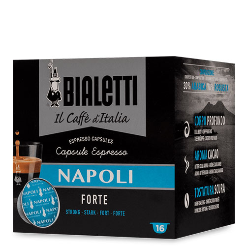 De Bialetti Napoli koffie capsules is een intense, omhullende blend met een donkere branding en een diepe body. In Napels is koffie altijd een dagelijks ritueel geweest: het heeft een hoog cafeïnegehalte en een intense, volle smaak met geroosterde tonen en lichte hints van cacao.